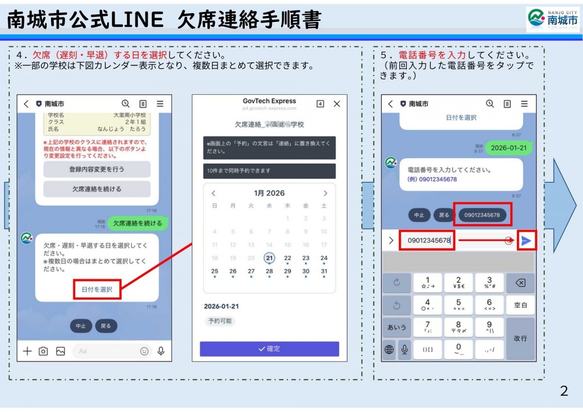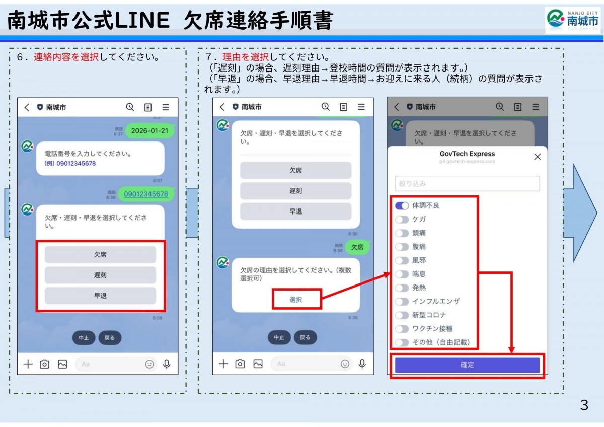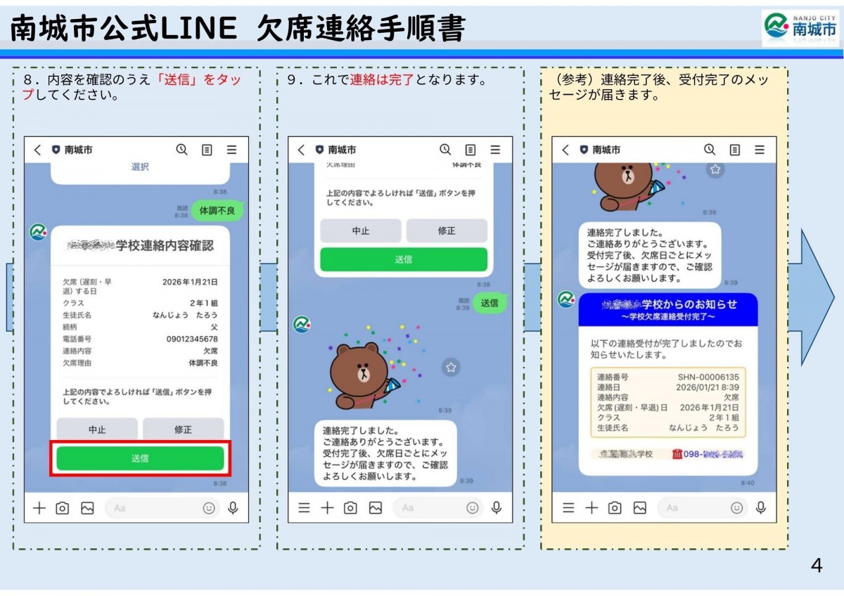 さて、欠席連絡の方法につきましては、南城市公式LINEを活用した手順書を学校ホームページに掲載しております。